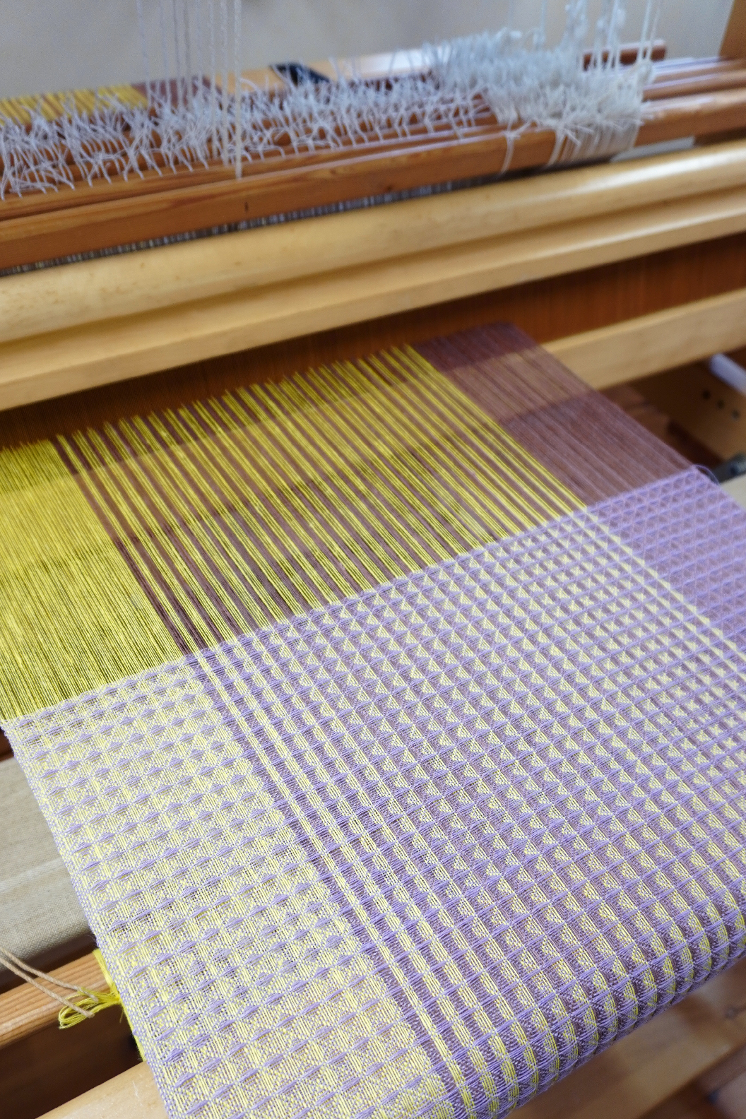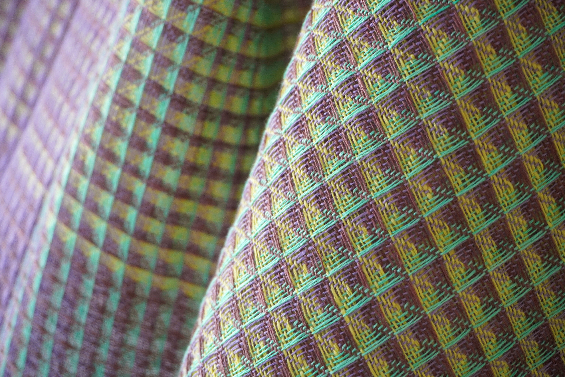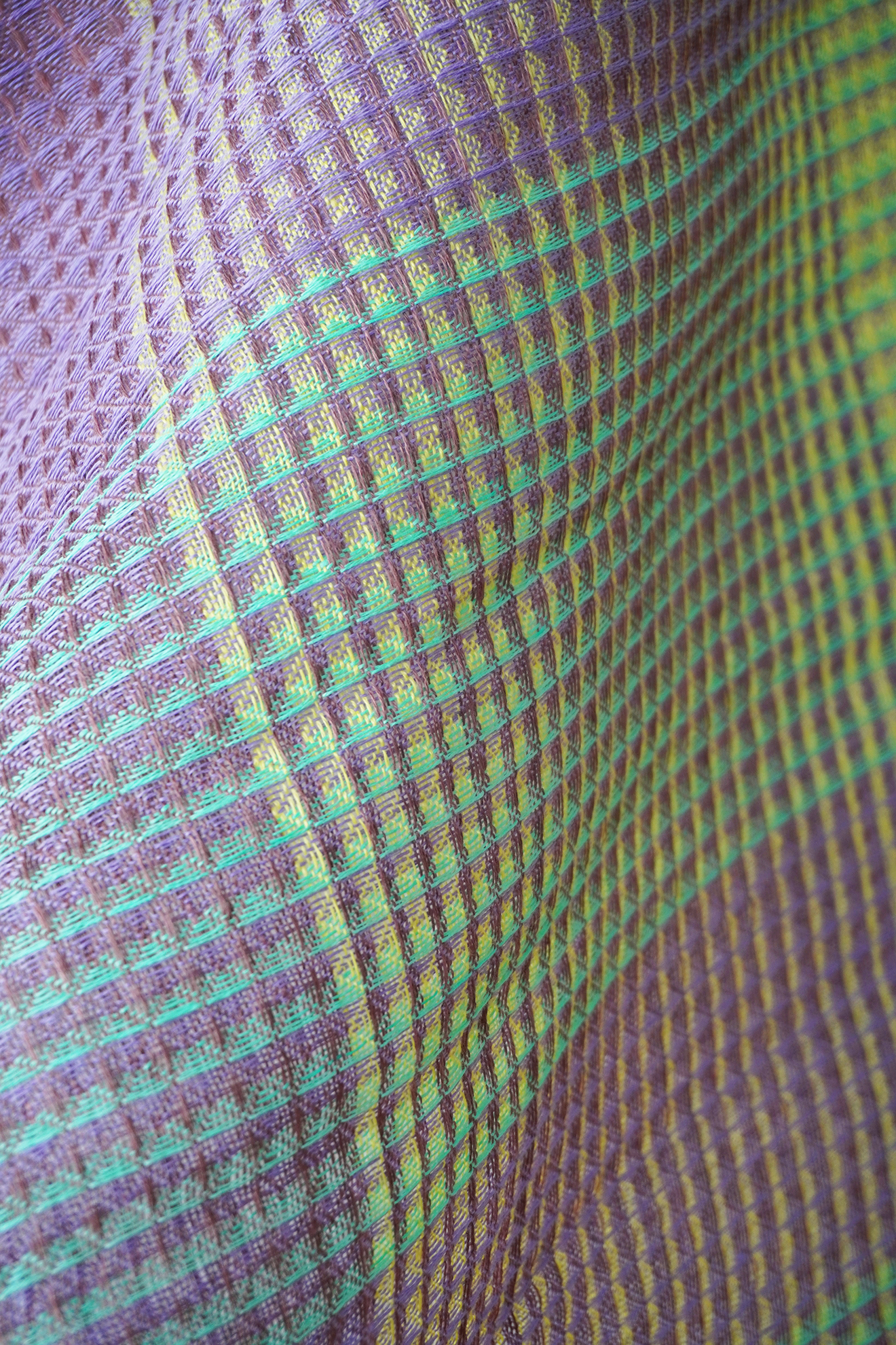 織物組織の凹凸を利用した、見る角度によって色が流れるように変化して見える生地。1枚の生地の中に明暗がグラデーショ ンになるよう経糸を配置し、だんだんと陰影の向きが変わって見えるような構成になっている。 色糸計画の後糸の染色から自ら行い、織物ならではの色糸表現と布構造による陰影を追求した。